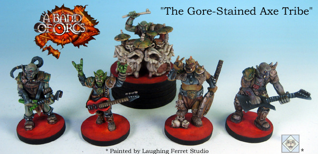 - Iconomancer of Gzoroth ($70 or more) – Get the Double Vinyl Picture Disc and a set of A Band of Orcs Gore-stained Axe Tribe Official Gaming Miniatures ($43 retail; see photo below), plus a digital download of the album the day before it drops and your name in the scrolls of the spared.