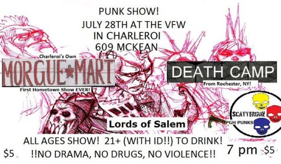 This extremely rare Mon Valley-area show features Death Camp, coming all the way from Rochester NY, alongside MorgueMart’s first show in their hometown, EVER (despite existing for about nine years)! Also appearing are Pittsburgh’s Scattergun, and another Charleroi native, Lords of Salem, playing their first show anywhere, ever.