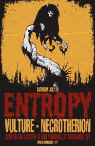 Entropy are a fantastic death metal band out of Wheeling WV; they’re being joined by the always-incredible Steel City Sludgers, Vulture; as well as a brand new addition to the line-up, Necrotherion, from Martins Ferry OH.