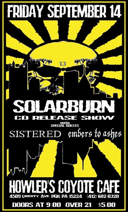 Yes, folks, it’s finally here: the instrumental metal machine that is Solarburn is unleashing its brand-new debut album 13 (pictured below)! Come on out to Howlers to party with the band, and pick up a CD or one of their newly-designed t-shirts! Also joining in the festivities are local metalheads Sistered (hear ’em here) and Embers to Ashes.