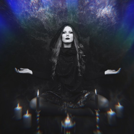 So where does the “black metal” element come into the equation? Here and there in between those book-ends, and all over the place as a general aesthetic. Almost halfway through the second song “Fractal Flesh” the sound breaks into straight-up black metal territory, complete with swirling chaotic drumming and growled/snarled vocals — although still we find those sweetly haunting clean vocals way in the background along with more of the ambient synthy stuff, making for a jarring juxtaposition. The only vocals to be found in “Refractions” are distorted howling vocals off in the distance somewhere, accompanied by plenty more ambiance and noise, and some kind of hellish wind-chime sounds.