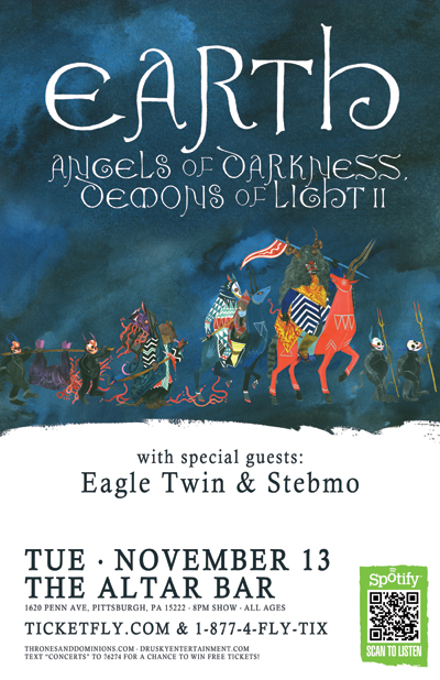 You can experience it for yourself tonight, when the band decends upon Pittsburgh’s Altar Bar. Joining them on this northeastern U.S. leg of their fall tour are Salt Lake City sludge/drone band Eagle Twin, and Stebmo, the solo project of multi-instrumentalist Steve Moore who has performed on record and onstage with a variety of other artists, including Earth, and their scions Sunn O))).