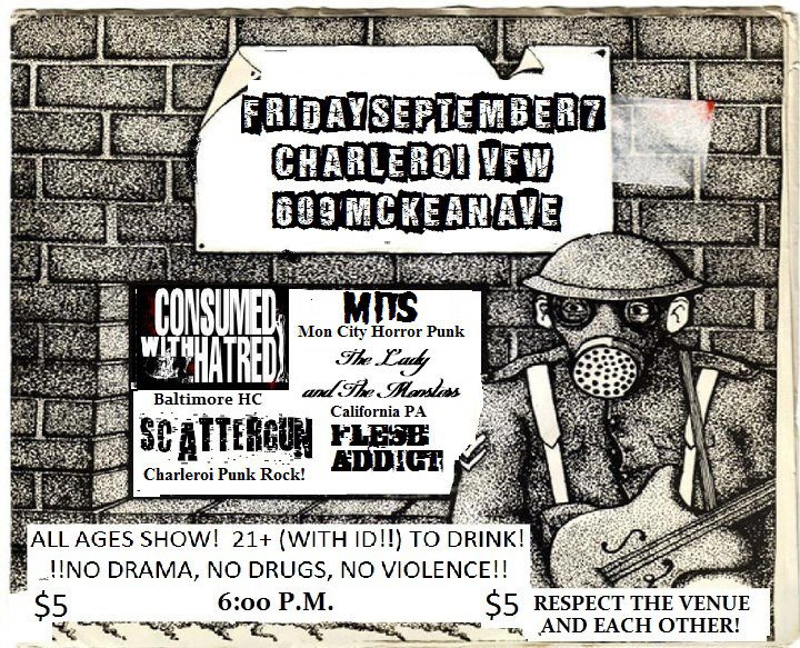 Hardcore band Consumed with Hatred from Baltimore is coming to visit the Mon Valley, appearing tonight with Pittsburgh punks Scattergun, horror punk band MITS from Mon City,